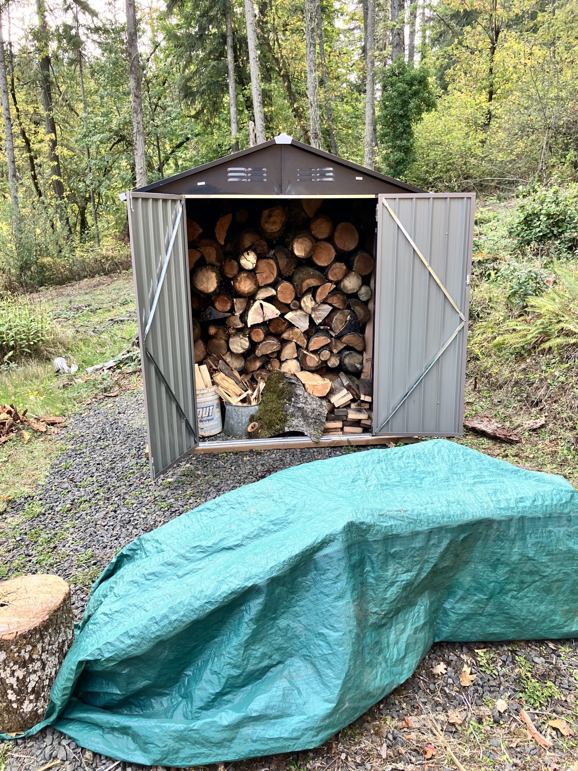 The Obsidian Grounds buzzed with activity on this perfect fall day. I have never seen so much accomplished in one work session. Firewood was gathered and split and filled the new woodshed. All the bits of limbs and trees were cut up. The beds were tackled and tamed as well as all areas mowed. Stubborn roots were dug up by first time volunteers. (Whew! I hope they come back!) Pesky blackberries on a slope got the heave ho. The woodshed door was adjusted.