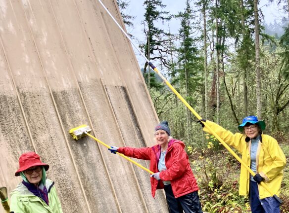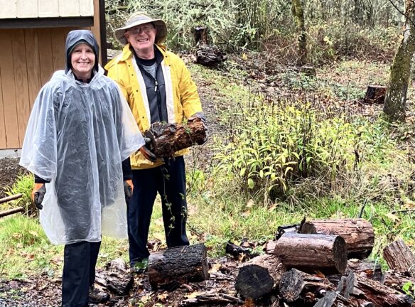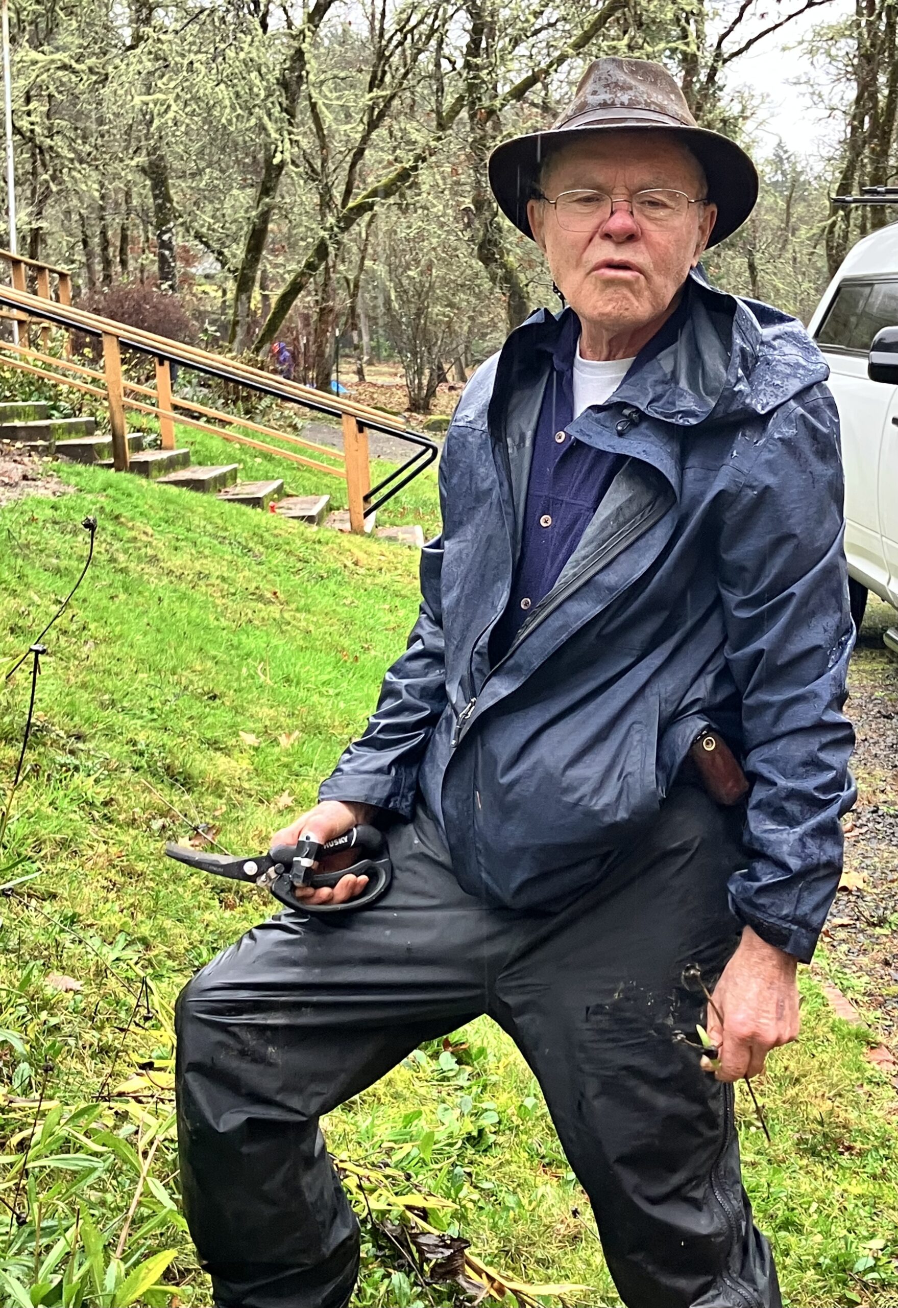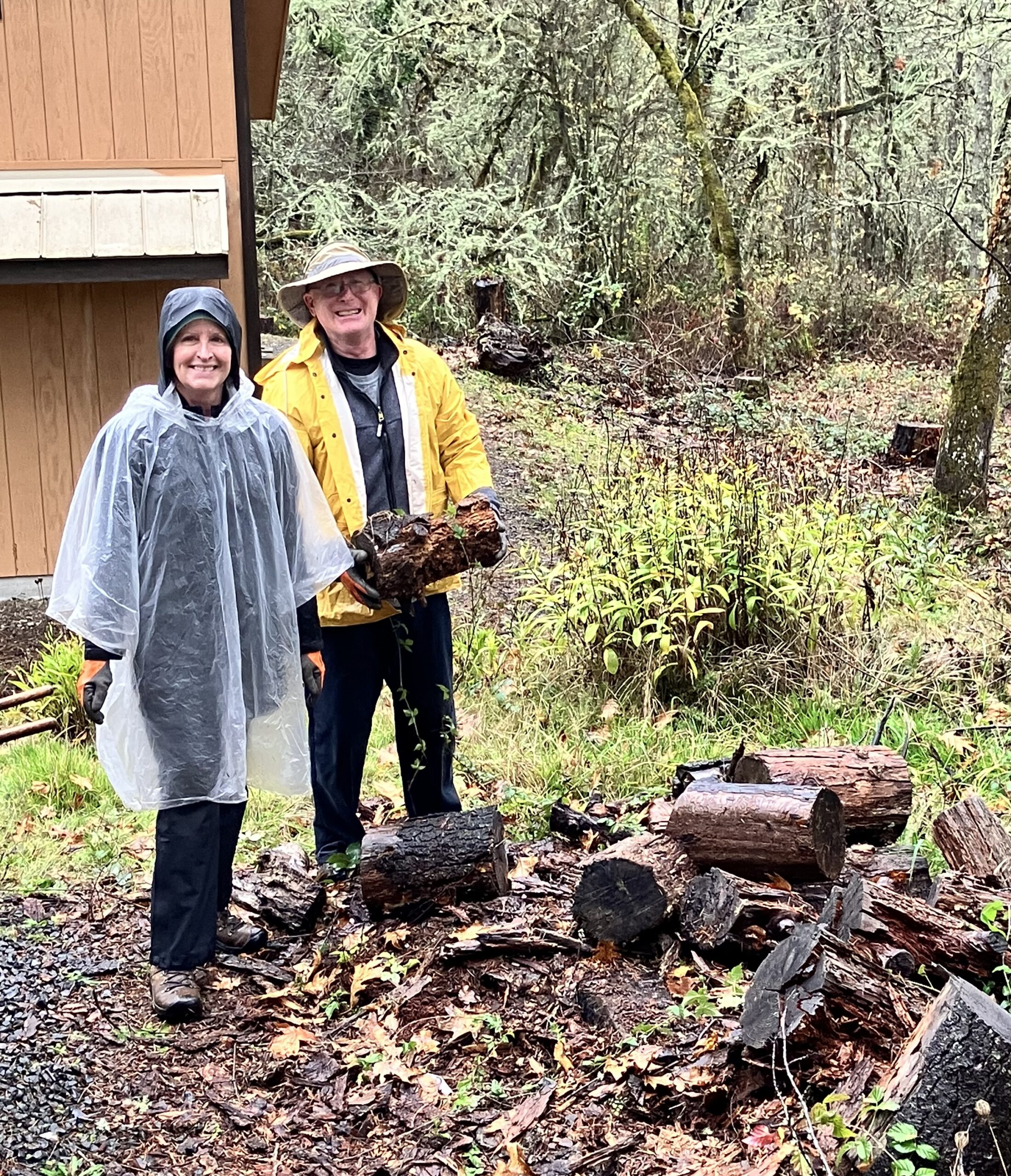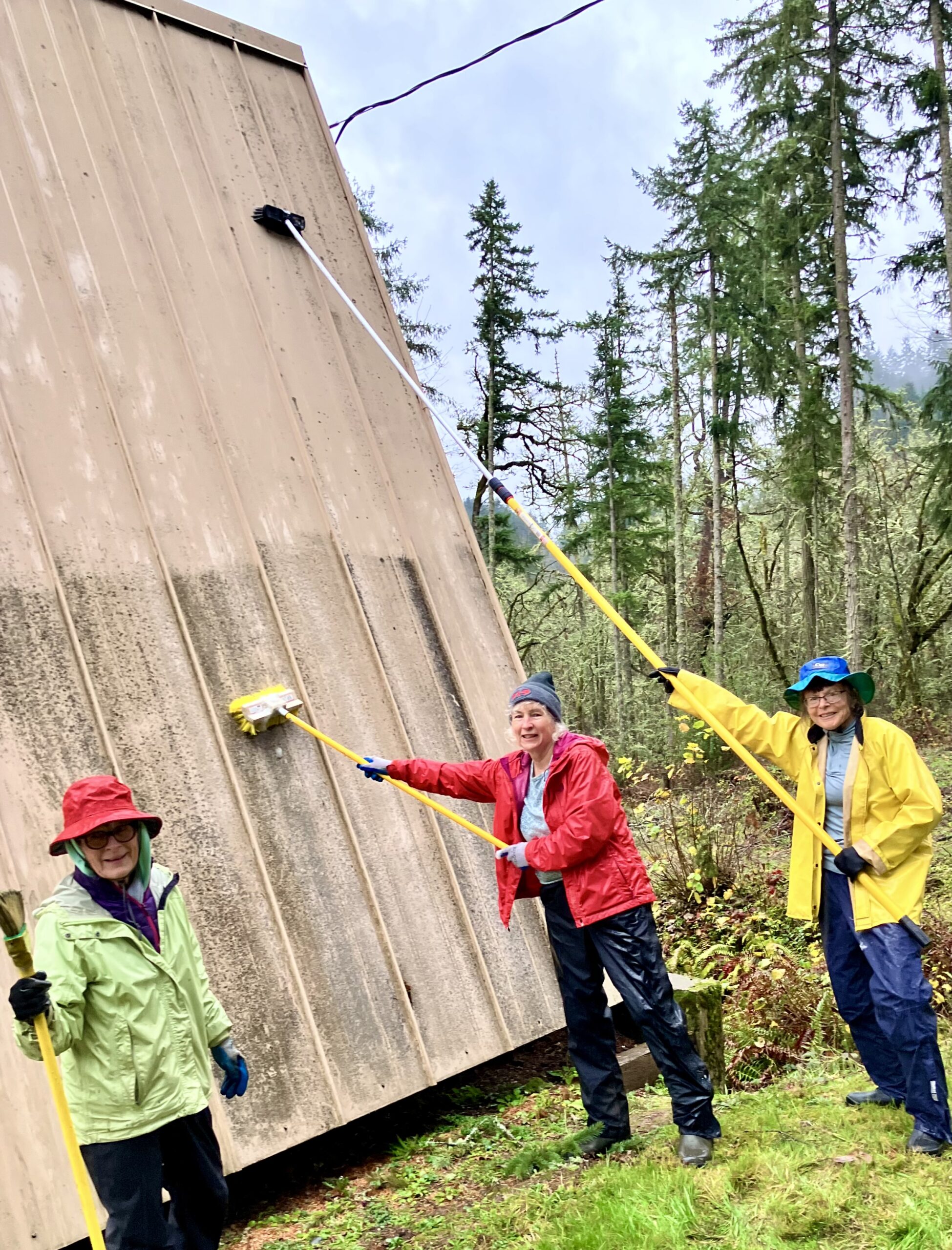 Fifteen stalwart volunteers worked in the not-so-cold rain to accomplish many tasks. The miracle of the day was the transformation of the back roof after it was washed. Firewood was gathered and tarped, parking lot and lodge beds were trimmed and pruned and old boards were cut up and split for kindling. The clogged gutters were cleared and the heaters inside were inspected and cleaned. The location of the septic tank was verified, marked and recorded with photos. Clearing on the west fence continued. The highlight of the day -a special birthday celebration for Mike Smith!