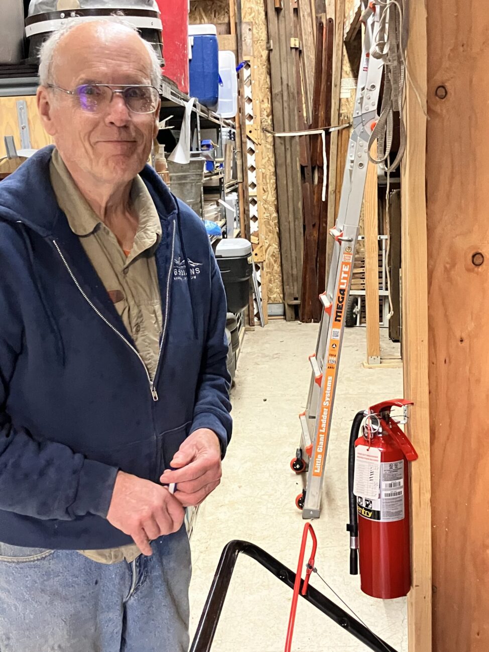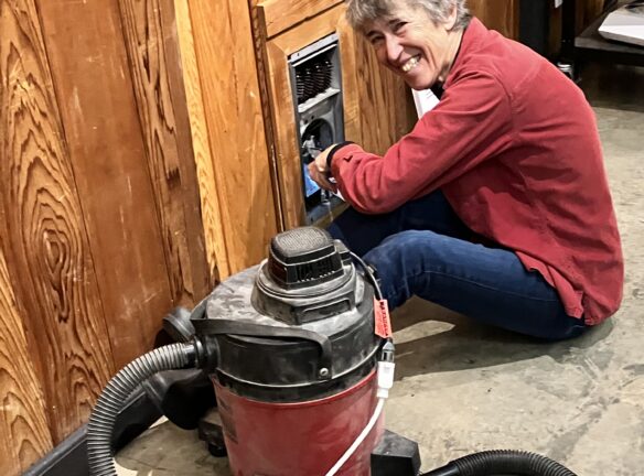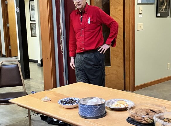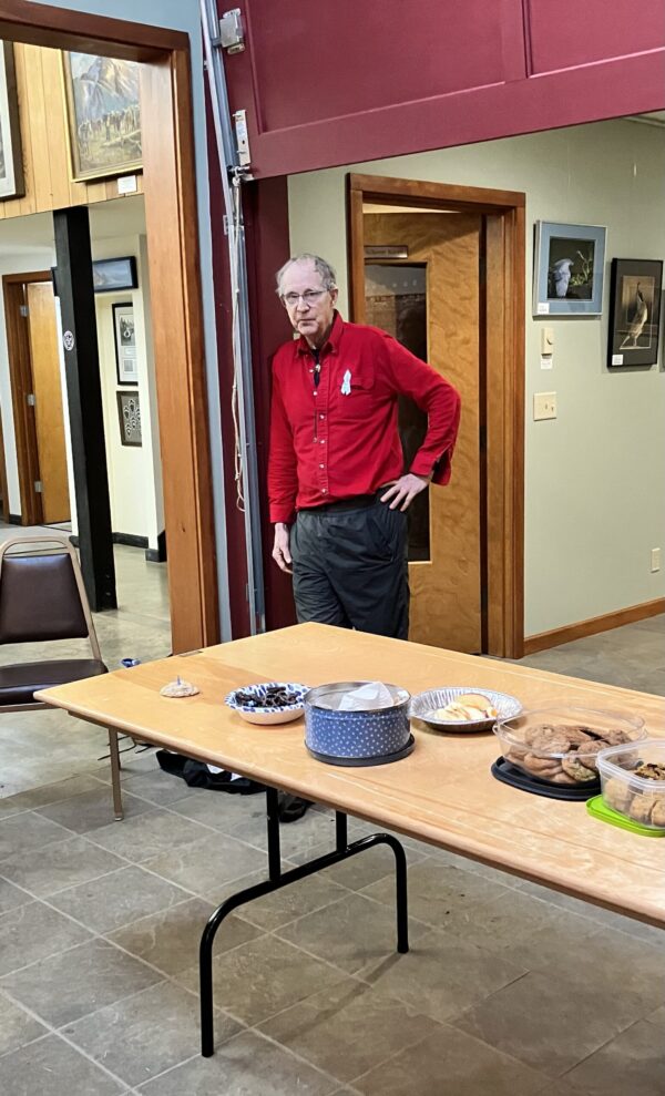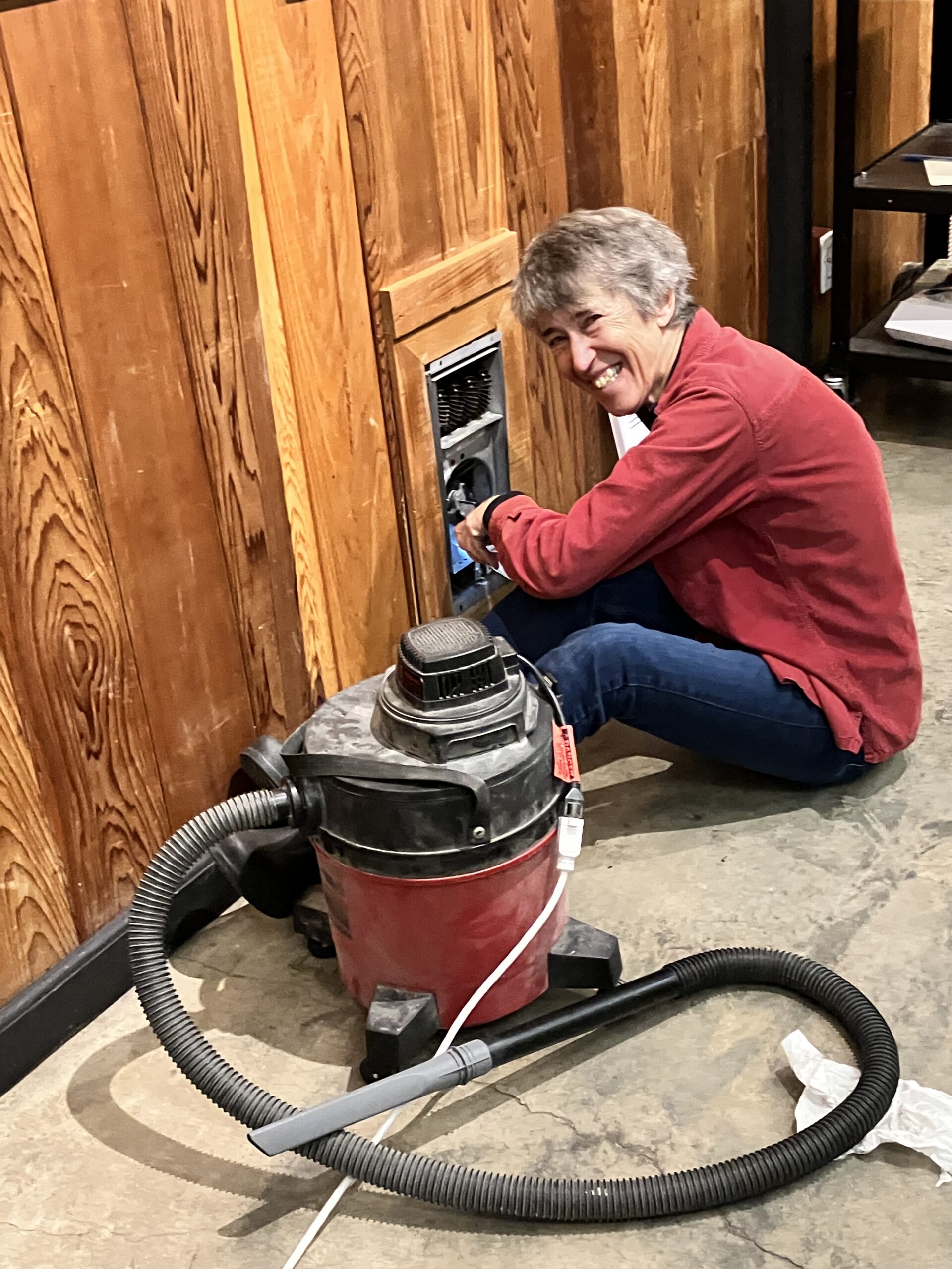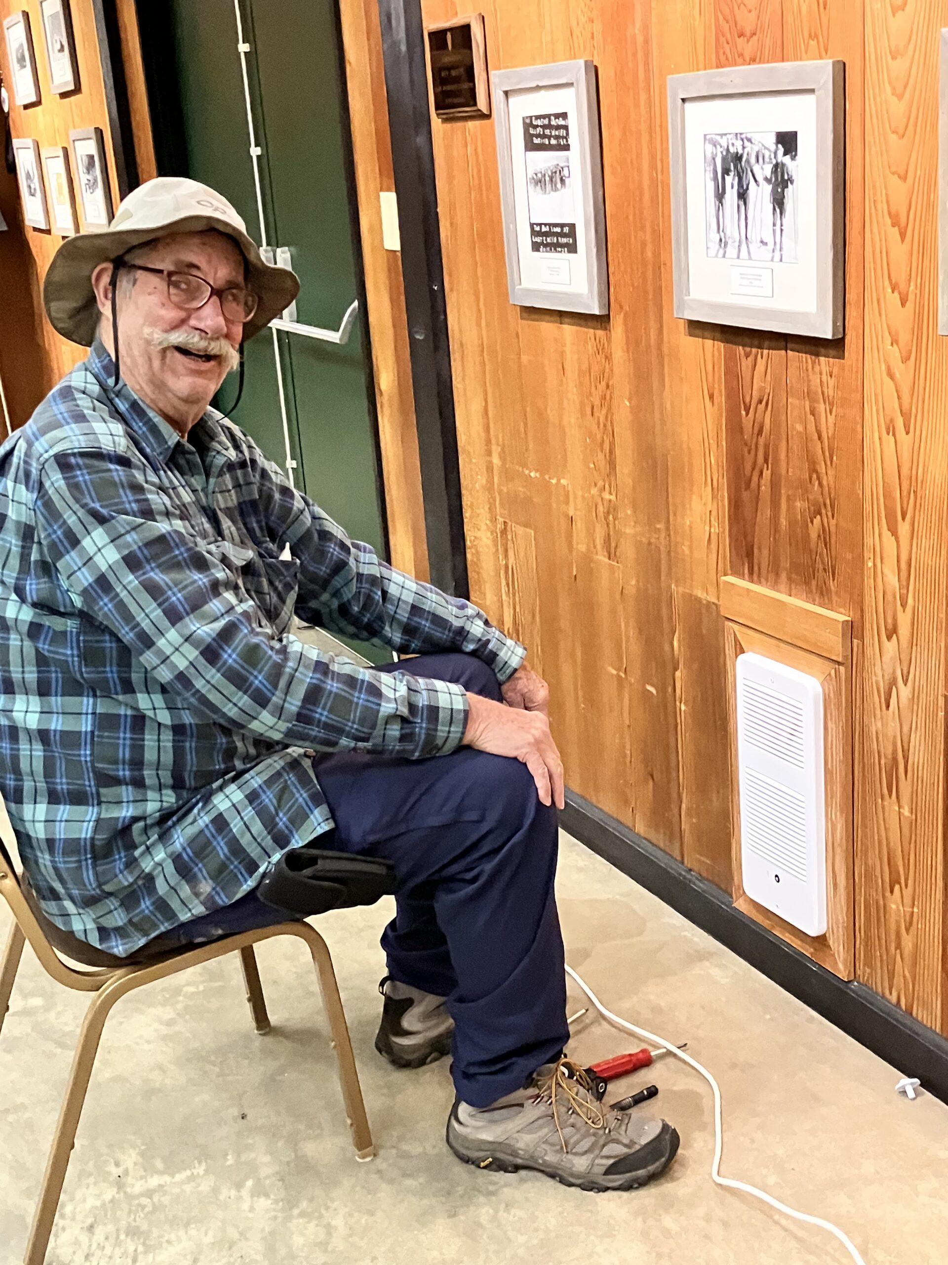 Fifteen stalwart volunteers worked in the not-so-cold rain to accomplish many tasks. The miracle of the day was the transformation of the back roof after it was washed. Firewood was gathered and tarped, parking lot and lodge beds were trimmed and pruned and old boards were cut up and split for kindling. The clogged gutters were cleared and the heaters inside were inspected and cleaned. The location of the septic tank was verified, marked and recorded with photos. Clearing on the west fence continued. The highlight of the day -a special birthday celebration for Mike Smith!