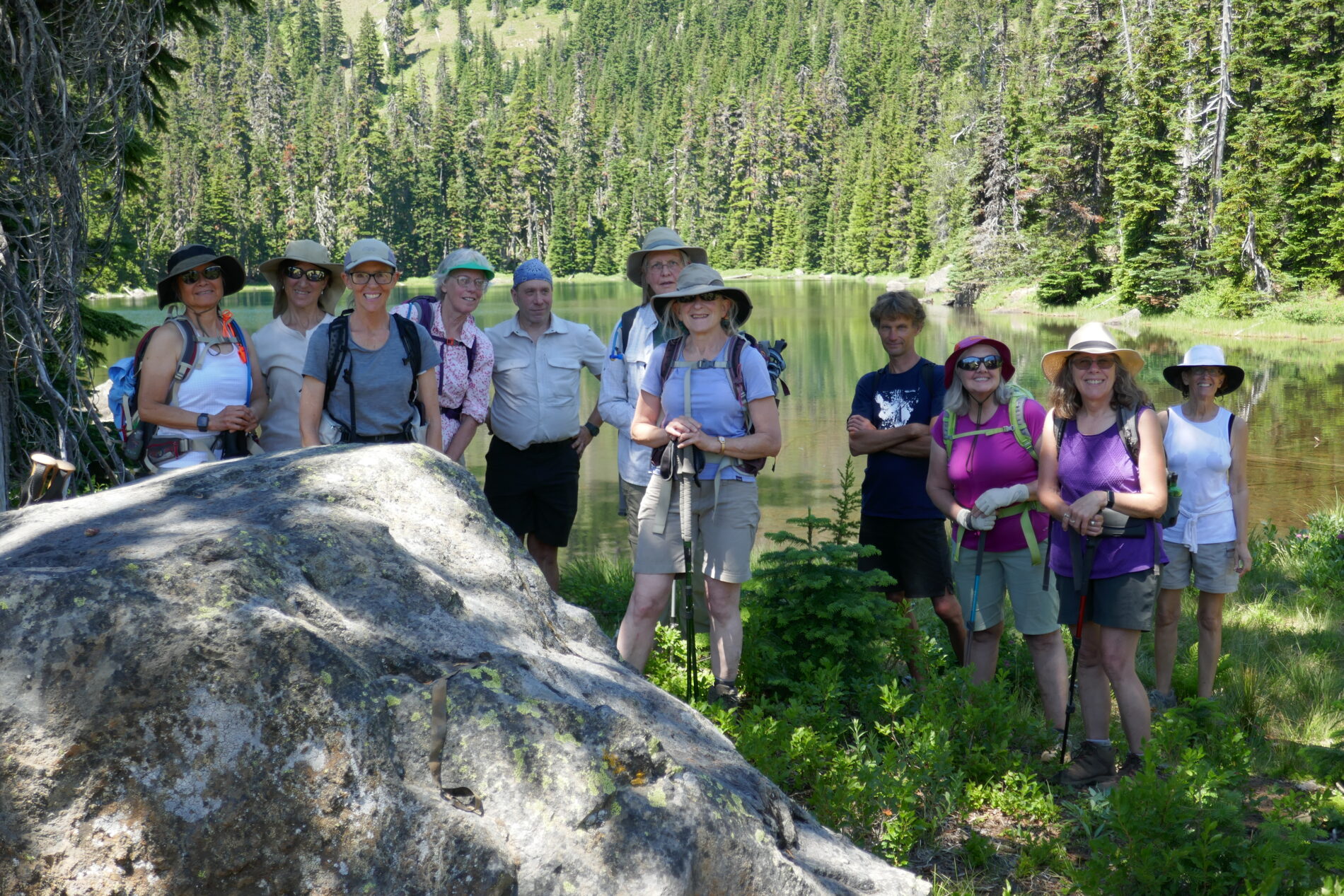 Mild temperatures and an impressive Beargrass bloom welcomed our group of twelve hikers on their trek to Martin Lake. This nine-mile loop hike begins at the Santiam Pass PCT trailhead and heads north towards Three Fingered Jack where we left the trail to hike cross-country past Martin Lake to join the Old Summit Trail. From here we headed south past Booth Lake to Square Lake, where six of our group went for a swim before heading back to our trailhead.<br />
