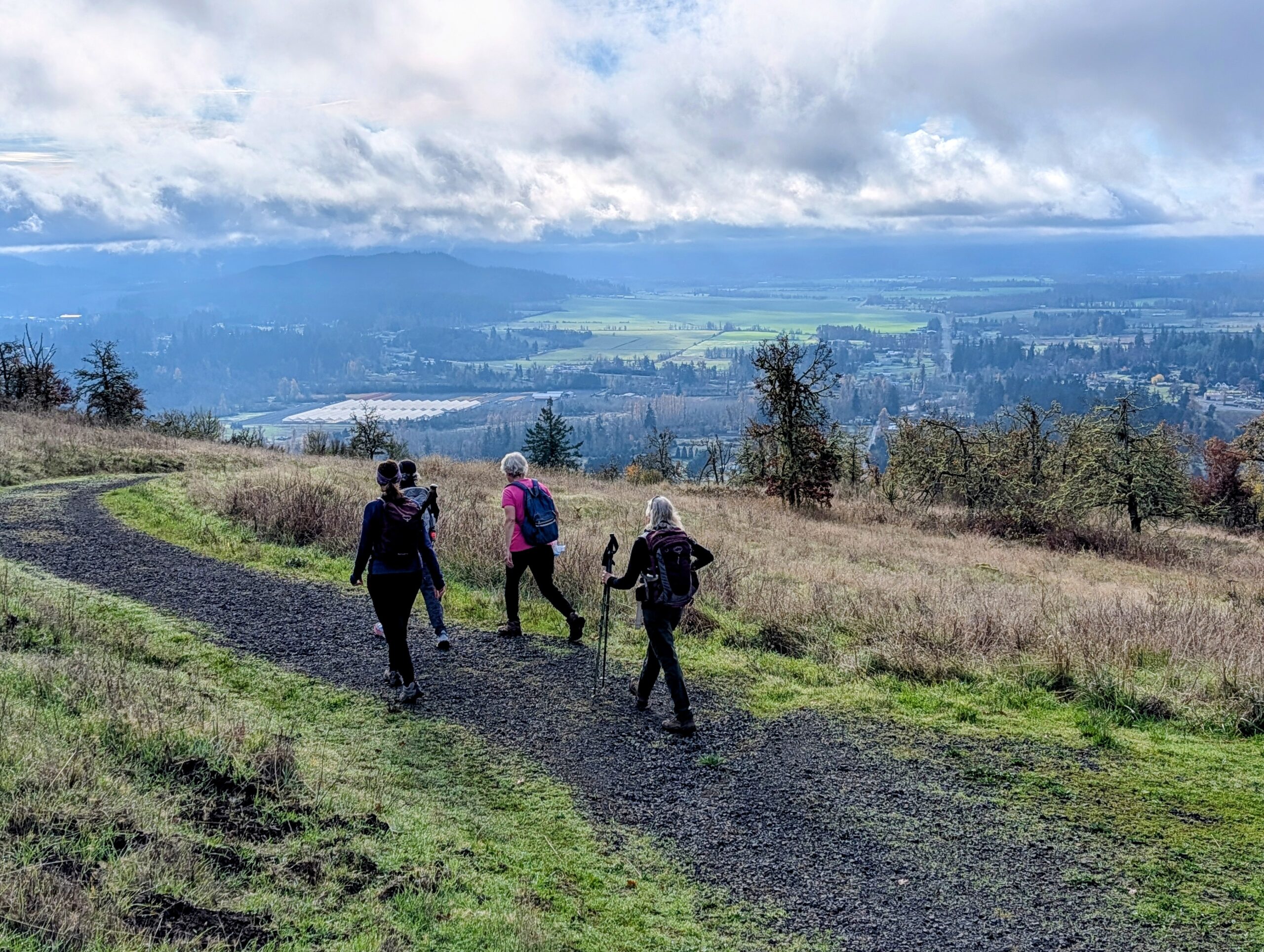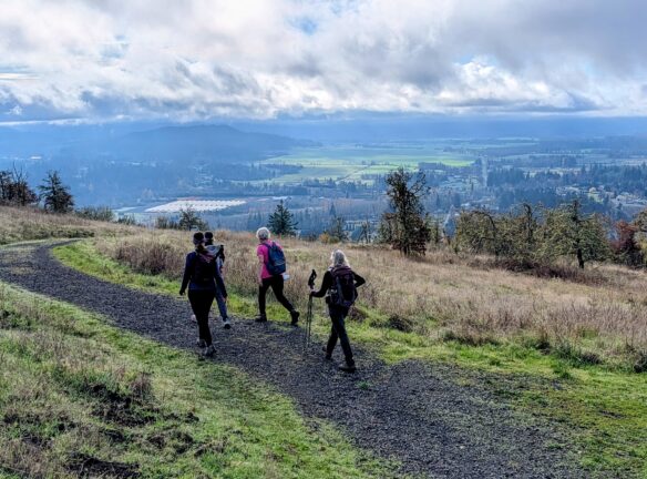 East Trailhead (search in Google maps for Mount Pisgah East Trailhead, Dery Rd, Pleasant Hill, OR 97455) – from Eugene, drive east on Highway 58 towards Pleasant Hill. Turn left on Ridgeway Road at the 76 Station and drive1.7 miles to the parking area on the left. The parking lot is small, but vehicles can also park on the main road if necessary. Lane County Parking Pass is required to park in the lot. This trailhead does not have a pass machine so passes need to be purchased ahead of time at the main parking area.